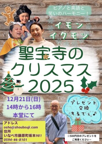 クリスマスコンサートを12月21日(日)14時より本堂で行います。