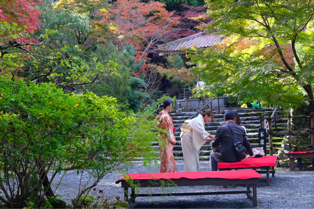 春と秋の風物詩、お茶の会のおもてなしを中心に庭園の様子を撮影いただきました。真っ赤になったカエデと真緑のカエデ、紅くなりつつあるカエデ、混在して同時に観賞できるのが秋の聖寶寺庭園の魅力のひとつです。様々な方が訪れ、様々な木々の色があります。
