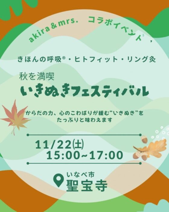| 内容 | – きほんの呼吸®︎ 呼吸エクササイズ – ヒトフィット 歪み改善セルフメンテナンス – リング灸 丹田から熱を入れ心身のリラックス |